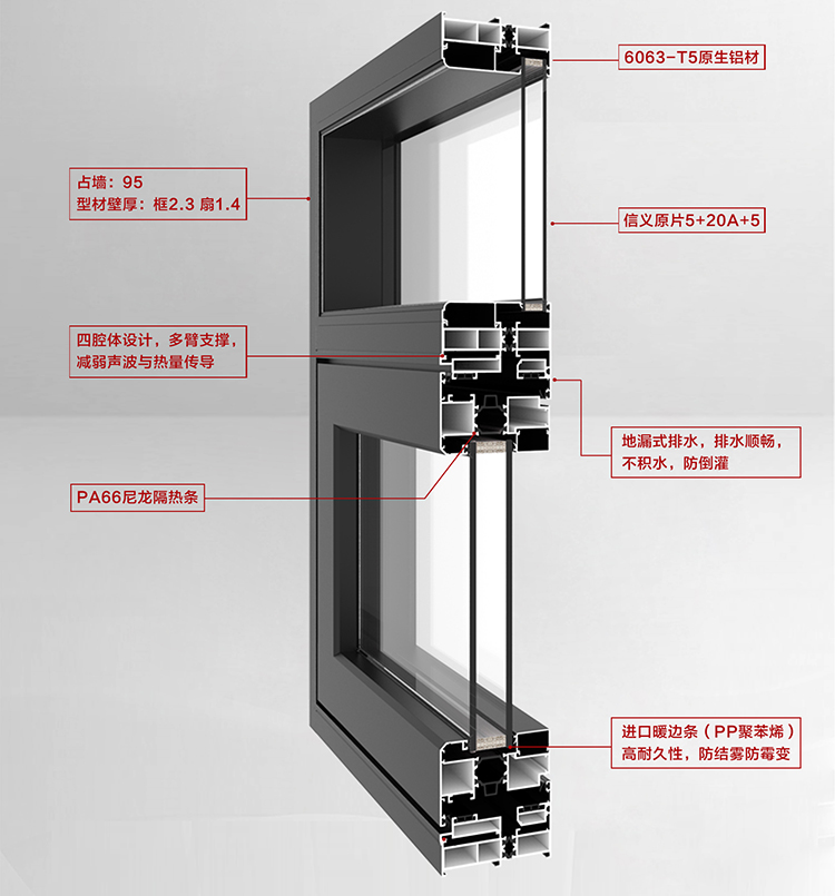 6063-T5原生鋁材 占墻:95mm 框:2.3mm 扇:1.4mm